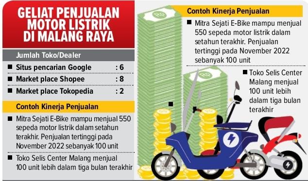 MALANG KOTA – Ekosistem sepeda motor listrik di Malang mulai menggeliat. Toko-toko yang menjual kendaraan tanpa bahan bakar minyak (BBM) pun terus bermunculan. Penjualan mereka melejit setelah terjadi kenaikan harga BBM yang menembus angka 30 persen pada September 2022 lalu.