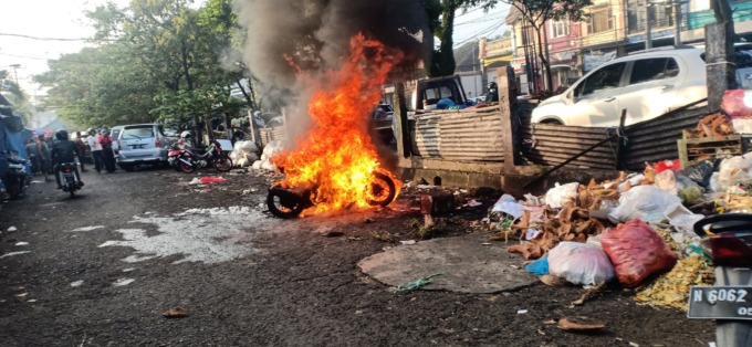 Sebuah motor matic terbakar di depan Pasar Blimbing, Senin (24/4), sekitar pukul 06.33.http://go.coltliqekajaya.my.id/1R7